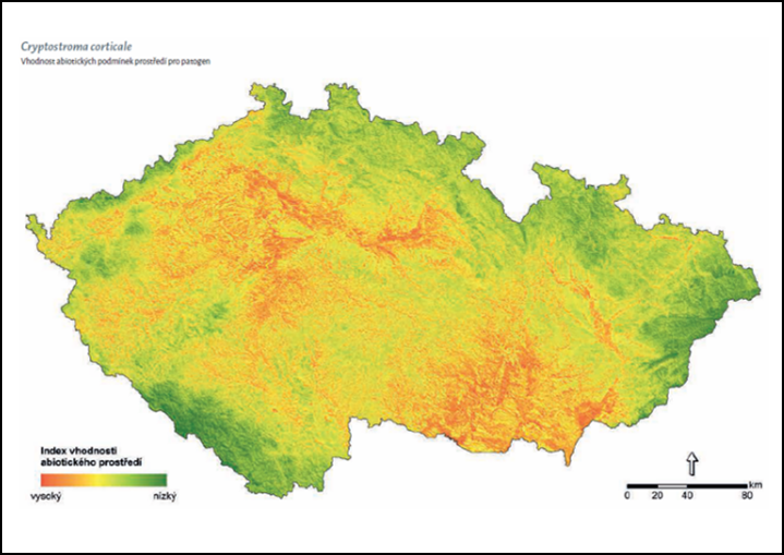 Atlas potenciální distribuce vybraných druhů invazních patogenů dřevin a jejich impaktu na lesní ekosystémy v ČR